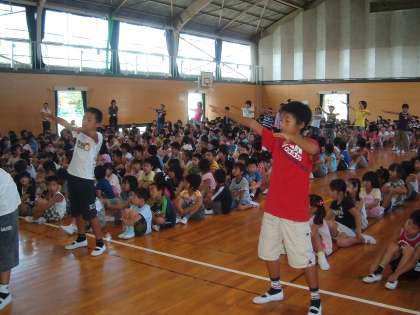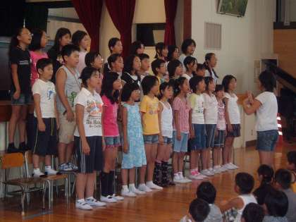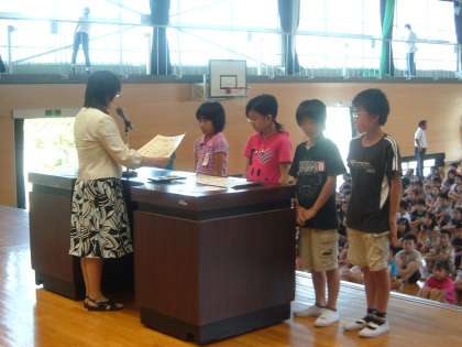 きょうは全校出校日で、朝礼のときに写生大会、おりもの感謝祭ポスター、水泳選手権大会の表彰伝達を行いました。また、合唱部が22日の合唱祭に出場するため、その壮行会を行いました。合唱部の曲の披露と、児童会を中心とする子たちによる応援のエールを行いました。