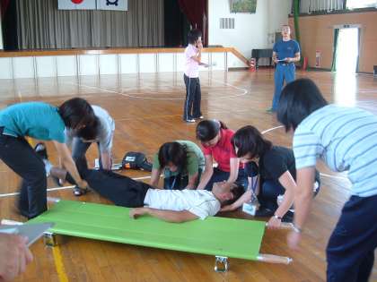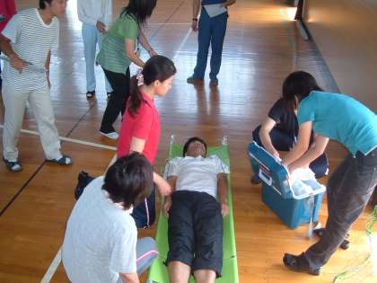 千秋消防出張所から講師としてきていただき、熱中症にかかったことを想定して対応訓練を行いました。今年は、雨続きであまり騒がれていませんが、きょうのように天気がよくなると一気に気温が上昇して危険な状態になります。万が一のことを考え、対応訓練を通して、対応力を身に付けるように努めています。