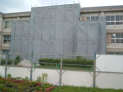 8月5日 耐震工事が進んでいます。 公開日 2009/08/05 更新日 2009/08/05 3年 2年生の教室の南側に防音の幕が張られました。大変暗くなると思いましたが、意外と薄く、思ったより明るかったです。