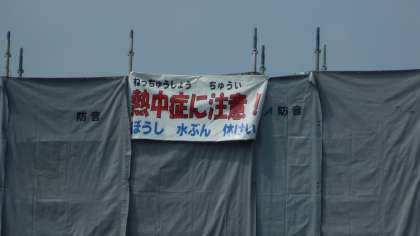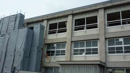 夏休みも後半になり、耐震工事もかなり進んでいます。今日は、耐震工事区域以外の教室の窓ガラスの取替えを行いました。早く工事が終了して、新しい環境の中で勉強できるのが楽しみです。熱中症対策に向けての啓発のための横断幕を工事の関係で取り外していましたが、工事関係の方々の協力で足場に取り付けました。これから先、9月も暑い日が続くことが予想されるので、熱中症には十分に気をつけていきたいと思います。