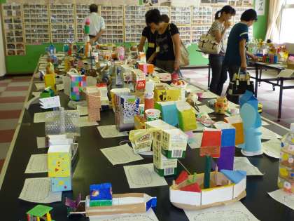 夏休みの作品を展示紹介する恒例の作品展をきょうとあす開催します。どの作品もいろいろな工夫があり、興味深いものに仕上がっています。また、5年生の野外教育活動のときの写真も展示してあります。明日は、子ども写生大会の巡回展もありますので、ぜひ子どもたちの作品を見に来てください。