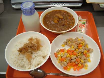 9月4日(金)の給食です。献立は、麦ご飯、牛乳、シーフードカレー、ビーンズサラダ(マヨネーズ)、福神漬けです。