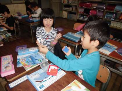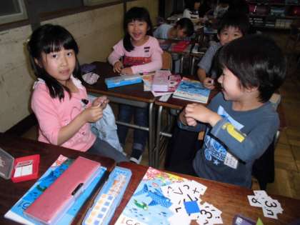 算数の時間に、数字の分だけ数図ブロックを並べたり、数字の大きさ比べをしたりしました。最後は、先生がタンブリンで叩いた数だけ数字カードを出しました。みんなバッチリでした。