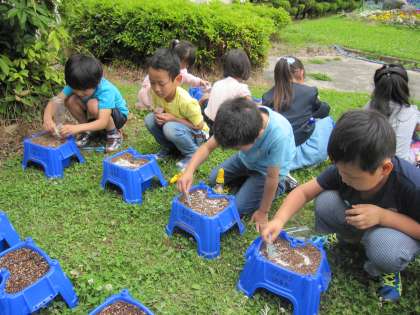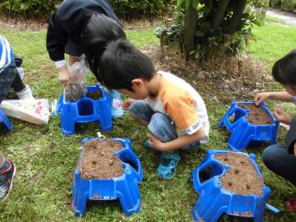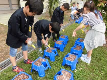 アサガオの種をまきました。土を入れて、指で穴をあけました。種を入れて、そっと土をかぶせました。肥料をあげて、水をたっぷりあげました。いつ芽が出るかな。