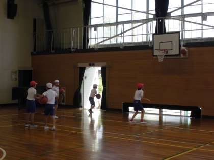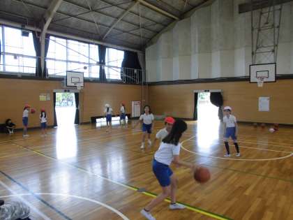 5月に入り、5年生の屋内運動場での体育はバスケットボールに取り組んでいます。