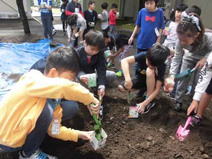 2組では、ツルレイシの種を植えました。早く芽が出て、ゴーヤができるのが楽しみですね。