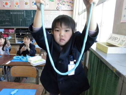 図工の時間に「ひもひもねんど」をしました。粘土をよくねって柔らかくして、長く伸ばしました。自分の背より長くなった人もいました。
