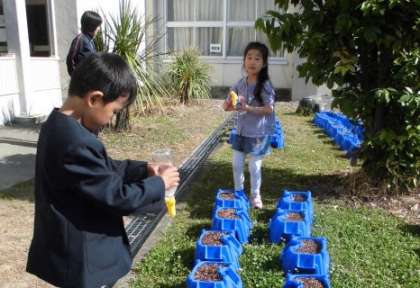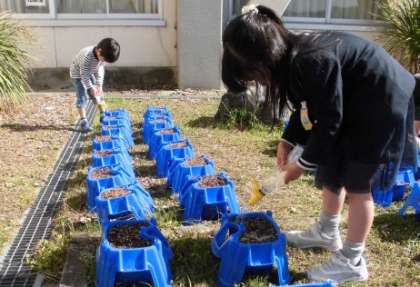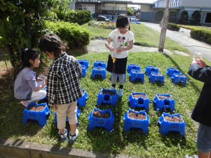 朝の水やり、がんばってます。アサガオにたっぷり水をやってから、まだ時間があった人はサツマイモの苗にも、水をやっていました。芽が出るのが楽しみですね。