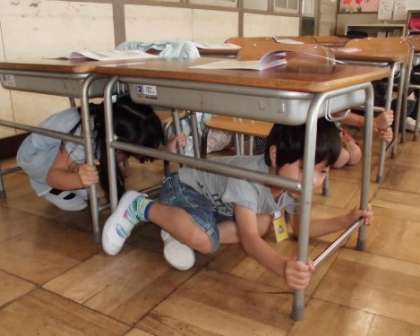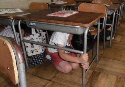 避難訓練がありました。大きな地震がきたらどうするかの訓練をしました。放送が入ったら、みんなさっと机の下に入り、机が動かないように、机の足をぐっと押さえました。