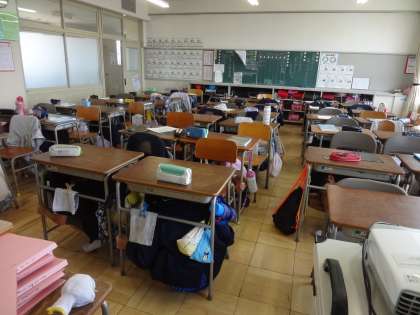 今回は、教室での避難について。しっかりと机の脚をつかんで、静かに頭を守ることができました。