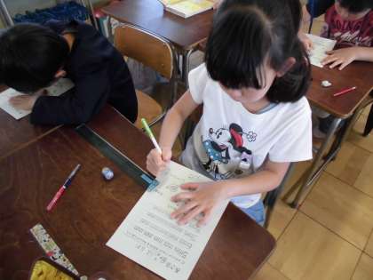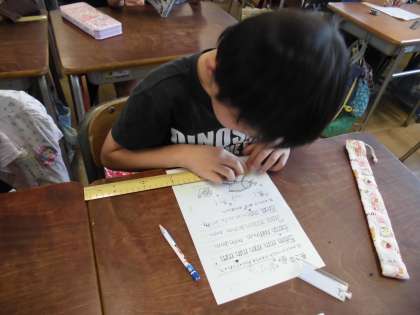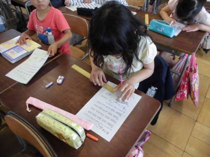 ものさしを使って、長さを測る勉強をしました。ミリメートルまで測るのがなかなか難しいですが、何回も練習して慣れてほしいと思います。
