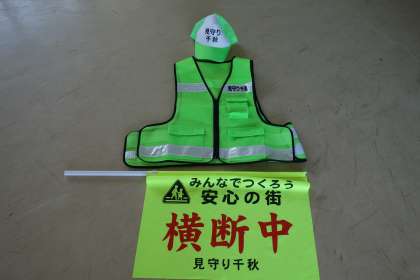 千秋町では、「千秋町連区地域づくり協議会」より、「見守り様のベスト・帽子・旗」が用意されています。