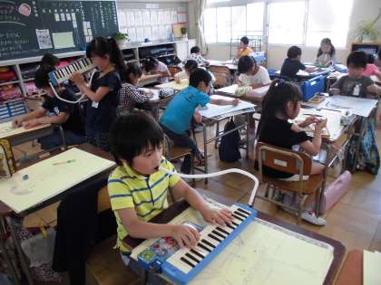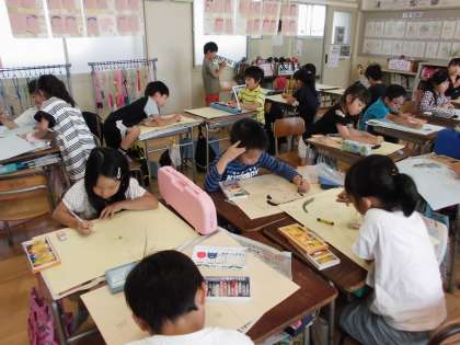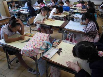 今日は、人物の色塗りをしました。2年生は人物はパスで色塗りです。髪の毛1本1本までよく見て描くこと、輪郭は柔らかく描くこと、など説明してから描き始めました。みんな真剣に一生懸命描いていました。