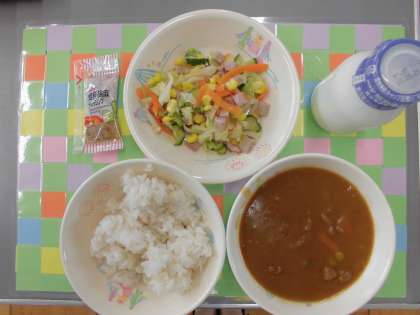 ごはん、牛乳、ビーフカレー、ハムサラダ、 ごまドレッシング