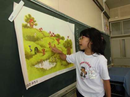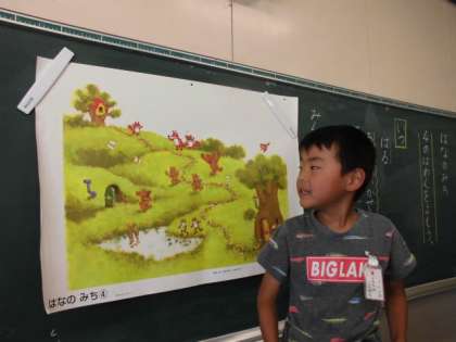 国語の「はなのみち」の学習で、絵に出てくる動物たちがどんなことを話しているのか考えて発表しました。「カエルさんは『見て見て。花のみちができたよ。』と言ってます。」「くまさんは『わあい!ふくろに穴があいててよかった。花が咲いたよ。』と言っています。」「りすさんは、『ぼくのうちから、くまさんのうちまで花がつながったよ。』と言っています。」みんな上手に発表しました。