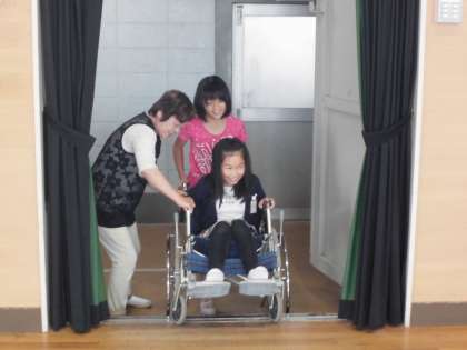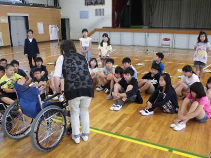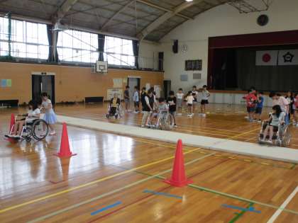 5月22日 福祉実践教室・その2 5年生 公開日 2018/05/22 更新日 2018/05/22 5年 福祉実践教室の後半は、車いす体験とガイドヘルプ体験のグループに分かれて実習を行いました。 下の写真は、車いす体験の様子です。 車いすに乗る役、車いすを介助する役の両方を体験しました。 車いすで段差を越える際に、乗っている子どもたちからは「怖い!」と声が上がり、介助する子たちも車いすの操作に苦戦する様子が見られました。