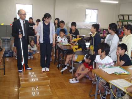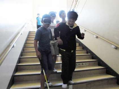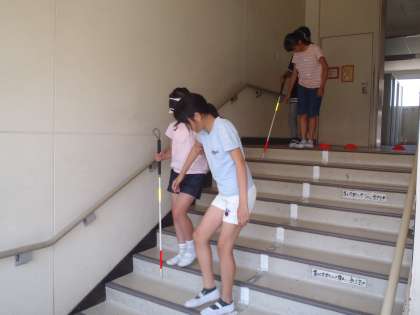 5月22日 福祉実践教室・その3 5年生 公開日 2018/05/22 更新日 2018/05/22 5年 下の写真は、視覚障碍者のガイドヘルプ体験の様子です。 アイマスクをした上で白杖を使い、目が見えない暗闇の状態でコースを歩く役、それを介助・誘導する役の両方を体験しました。