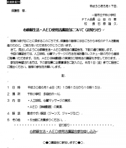 5月24日 心肺蘇生法・AED使用法講習会参加のお願い