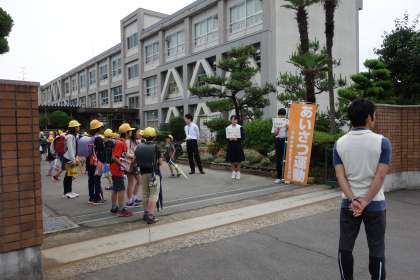 千秋中学校の生徒といっしょに「あいさつ運動」をしました。