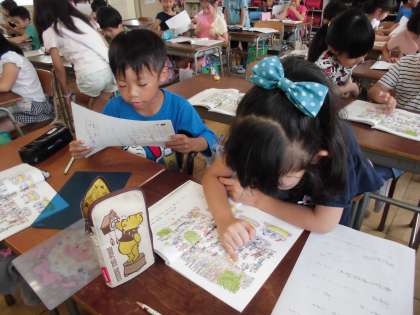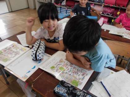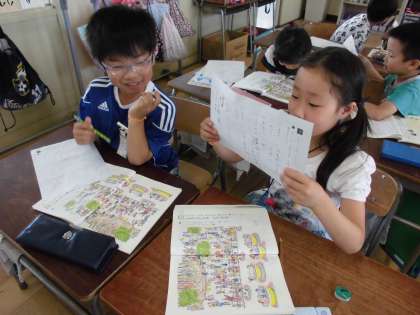 国語「とも子さんはどこかな?」の学習の発展として、みんなで迷子の子を呼び出す問題を作り、隣の子同士で問題を出し合っこしました。みんな、迷子の子はどこにいるかな?と一生懸命遊園地にいる子どもをさがしていました。