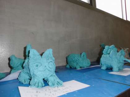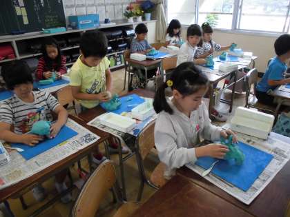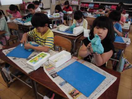 図工の時間に、全部の粘土を使って、大好きな動物をつくりました。足がしっかり立つように、粘土をひねり出し、粘土ベラも使って体の模様も工夫しました。みんな楽しく真剣な表情でつくっていました。