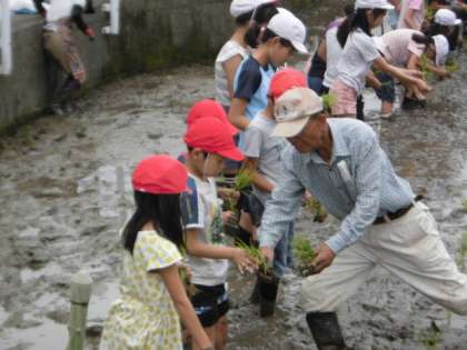 毎年学校の北側にある「千秋っ子ファーム」にもち米の苗を植えさせてもらっています。水田に入るのは年に一度だけ。