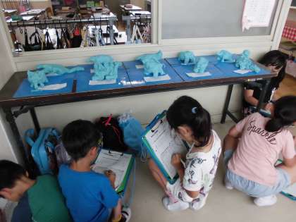 粘土でつくった動物の鑑賞会をしました。足やしっぽをひねり出して、身体の模様も工夫しました。友達のよいところをいっぱい見つけて、みんな真剣な表情でカードに書きこんでいました。自分でつくるだけでなく、人の作品を観るのも大変よい勉強になりますね!