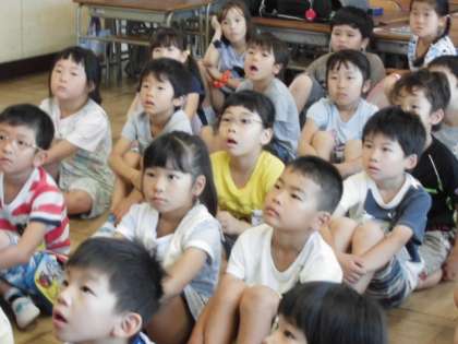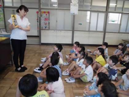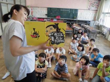朝の読書の時間に読み聞かせをしてもらいました。みんないっしょうけんめい聞いてると口が開いちゃいますね。