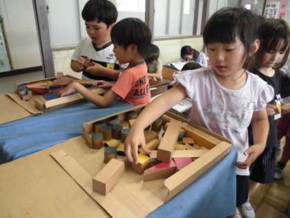 算数の「いろいろなかたち」の学習で、積木の形を紙にうつす学習をしました。箱の形からは四角がうつせました。筒の形からは丸がうつせました。いろんな積木から形をうつして、絵を描きました。いろんなものに見えましたね。