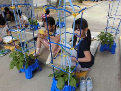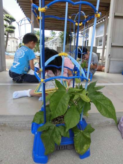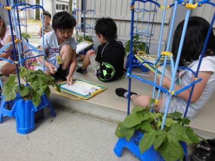 みんながせっせと水をやっているアサガオがどんどん大きくなっています。つるが伸びてきました。観察カードの書き方も上手になってきましたね。