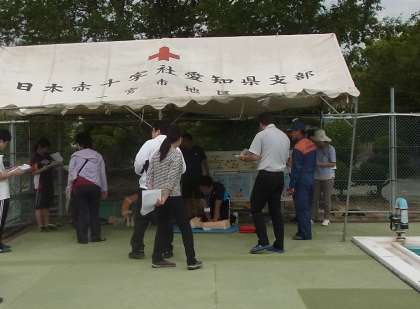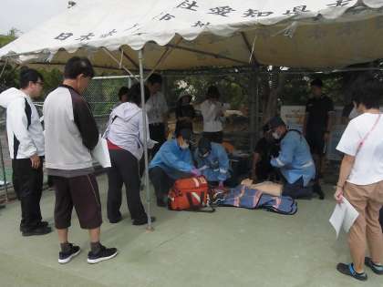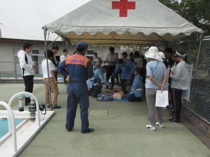 児童がおぼれたという場面を想定して、プールサイドで心肺蘇生 シミュレーション訓練を行いました。職員同士の連携や消防隊との連携を確認しながら進めました。
