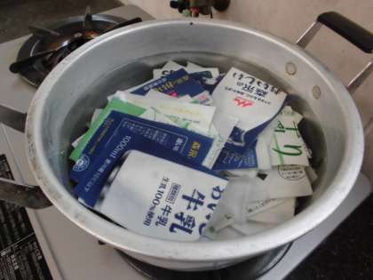今日は昨日切り取った牛乳パックを先生が真水で煮ました。