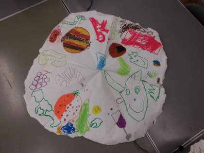 その次は、1分ずつ自分の好きな絵を描いて、時計回りに絵を描きたす遊びをしました。