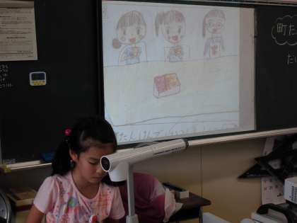 先日の続きで町たんけんの発表をしました。みんなスクリーンを見ながら楽しく発表を聞いていました。