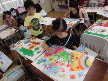 「ひみつのたまご」から、色々なものが飛び出しました!みんな思い思いに描きたいものを画面いっぱいに描きました。早く描けた子は、バックの色塗りも始めました。完成するのが楽しみですね!