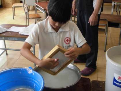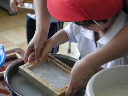 たらいにパルプを入れて、紙すきをしました。