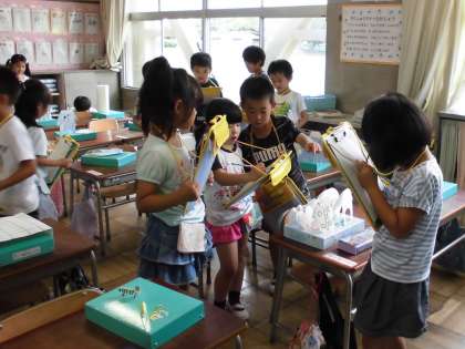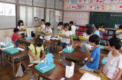 「折って立てたら」で作った作品を、みんなで鑑賞しました。「カラフルなところがいいね」「お城のドアがあるのが上手だね」と、たくさんのいい所を見つけていました。