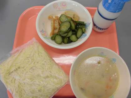 中華めん、牛乳、豚骨ラーメン、揚げギョーザ、きゅうりのナムル