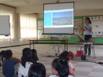 国際交流員の方を招いて、ニュージーランドの地理や食べ物についての話を聞きました。サーフィンをするサンタさんの写真を見て、日本とは季節が反対であることに驚いていました。
