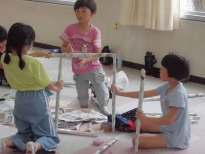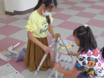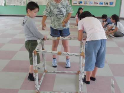 図工の時間に「つなぐんぐん」という単元で新聞紙や広告を使って班のメンバーと協力して作品をつくりました。皆仲良く考えながら素晴らしい作品をつくりあげることができました。