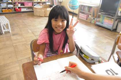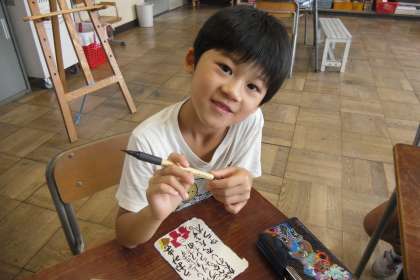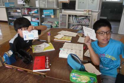 暑中見舞いのハガキを現在作成中です。誰に出すのかはお楽しみ!みんな、夏らしい思い思いの楽しい手紙が書けました。勿論、楽しく学習も頑張っています!この笑顔!!