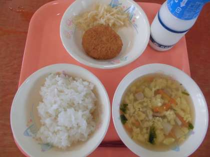 ごはん、牛乳、かきたま汁、キャベツ入りミンチカツ、たくあん