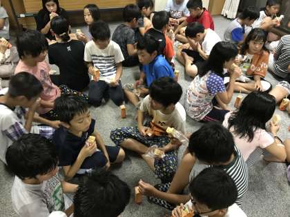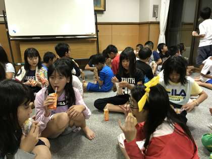 バウムクーヘンとオレンジジュースの夜食を取っています。