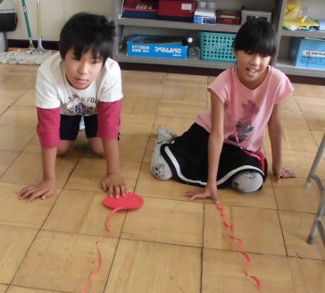 みんなでりんごの皮むきゲームをしました。とっても長い皮ができました。