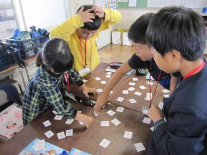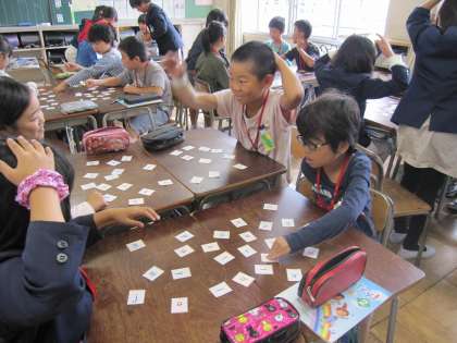 英語活動の時間にアルファベットの読み方を練習しています。今日はかるたを使って楽しく取り組みました。アルファベットは英語学習の基本です。身の回りでも探して、覚えていけるといいですね。