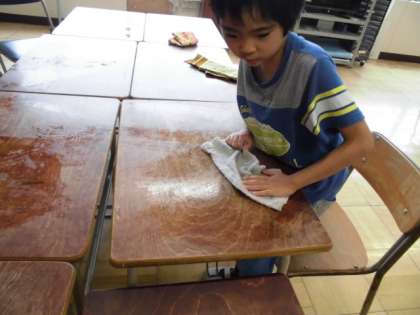 掃除の時間に机を拭いたり、廊下を磨いたり、学校をピカピカにしています。