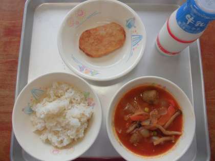 金芽ロウカットごはん、牛乳、ミートボールのトマト煮込み、ボロニアステーキ