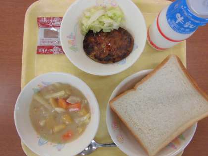 スライスパン、牛乳、栗のポタージュ、照り焼きバーグサンド、コンソメキャベツ、ココアパウダー