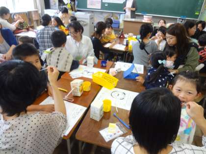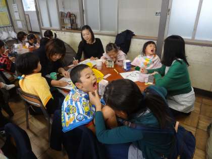虫歯テストに興味津々、染め出しに戦々恐々、の子ども達。