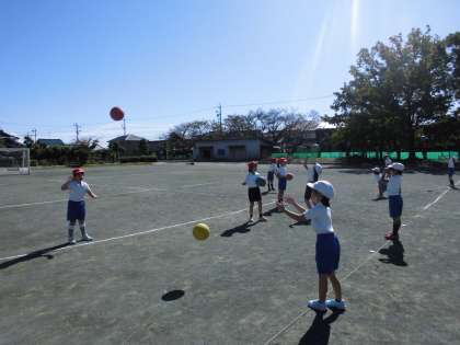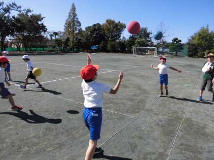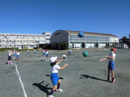 ドッチボールの練習として、お互いにパスを出してキャッチする練習をしています。相手とリズムを合わせて、楽しむ姿が印象的でした。